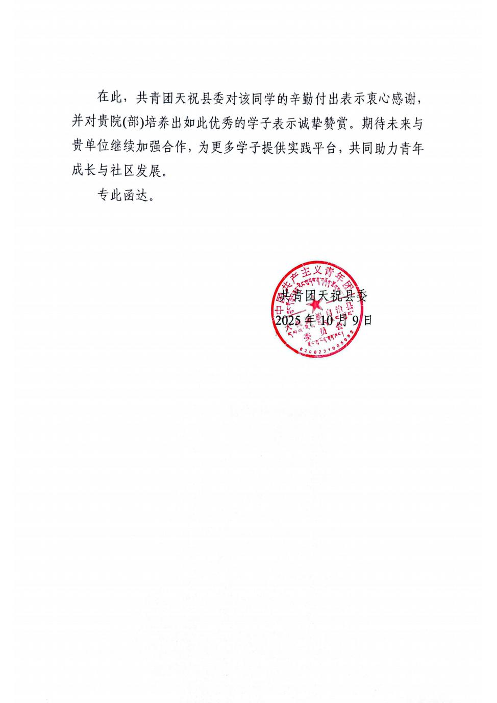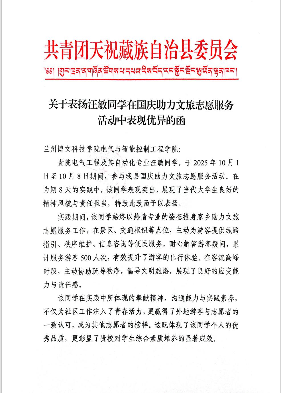 近日,共青团天祝藏族自治县委员会向我院发来表扬信,对电2023级电气工程及其自动化6班学生汪敏在2025年国庆假期期间参与家乡文旅志愿服务活动的突出表现予以高度肯定。汪敏同学以热情专业的服务、务实奉献的行动,成为当地文旅志愿服务的一抹亮丽青春色彩。