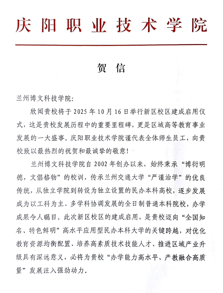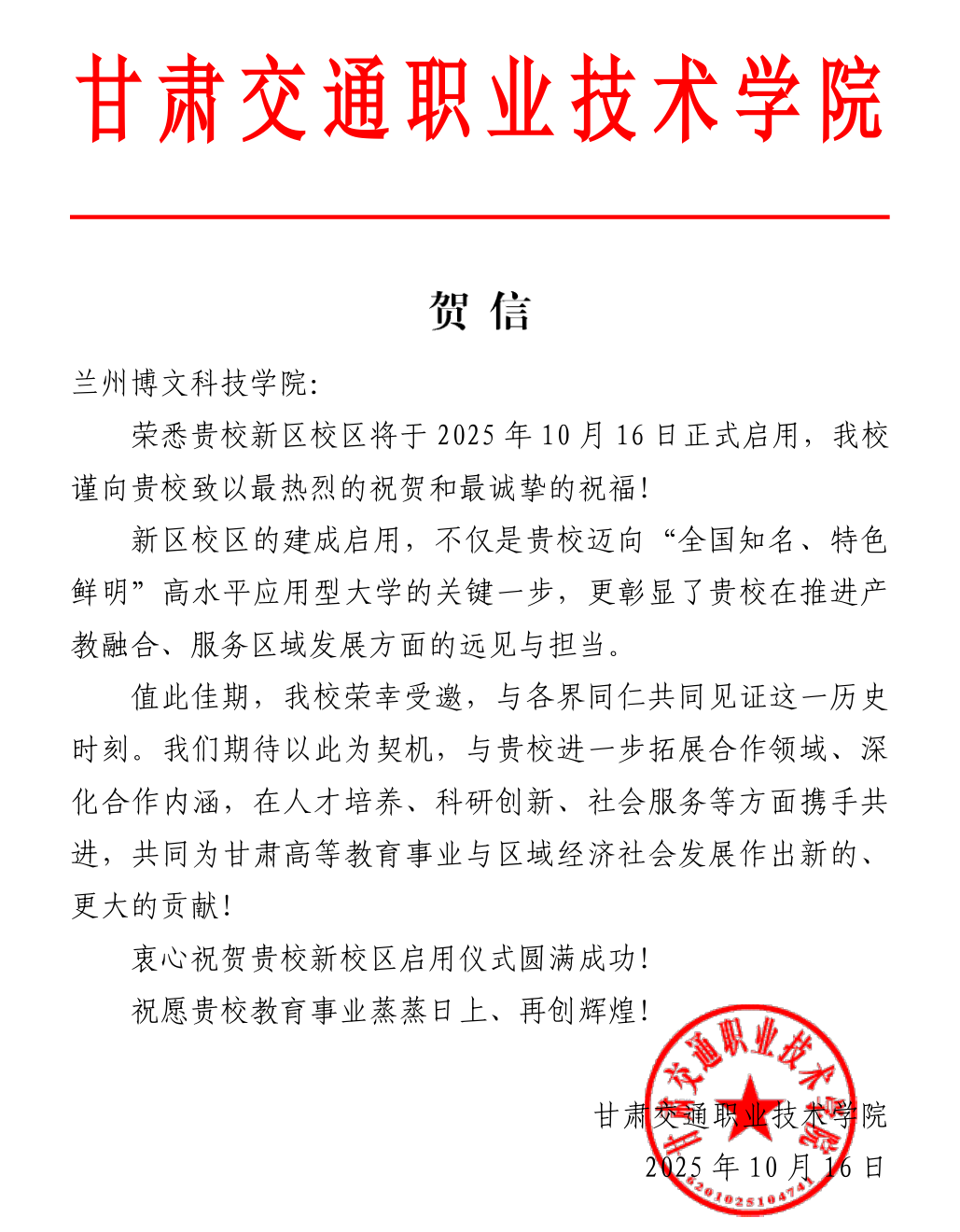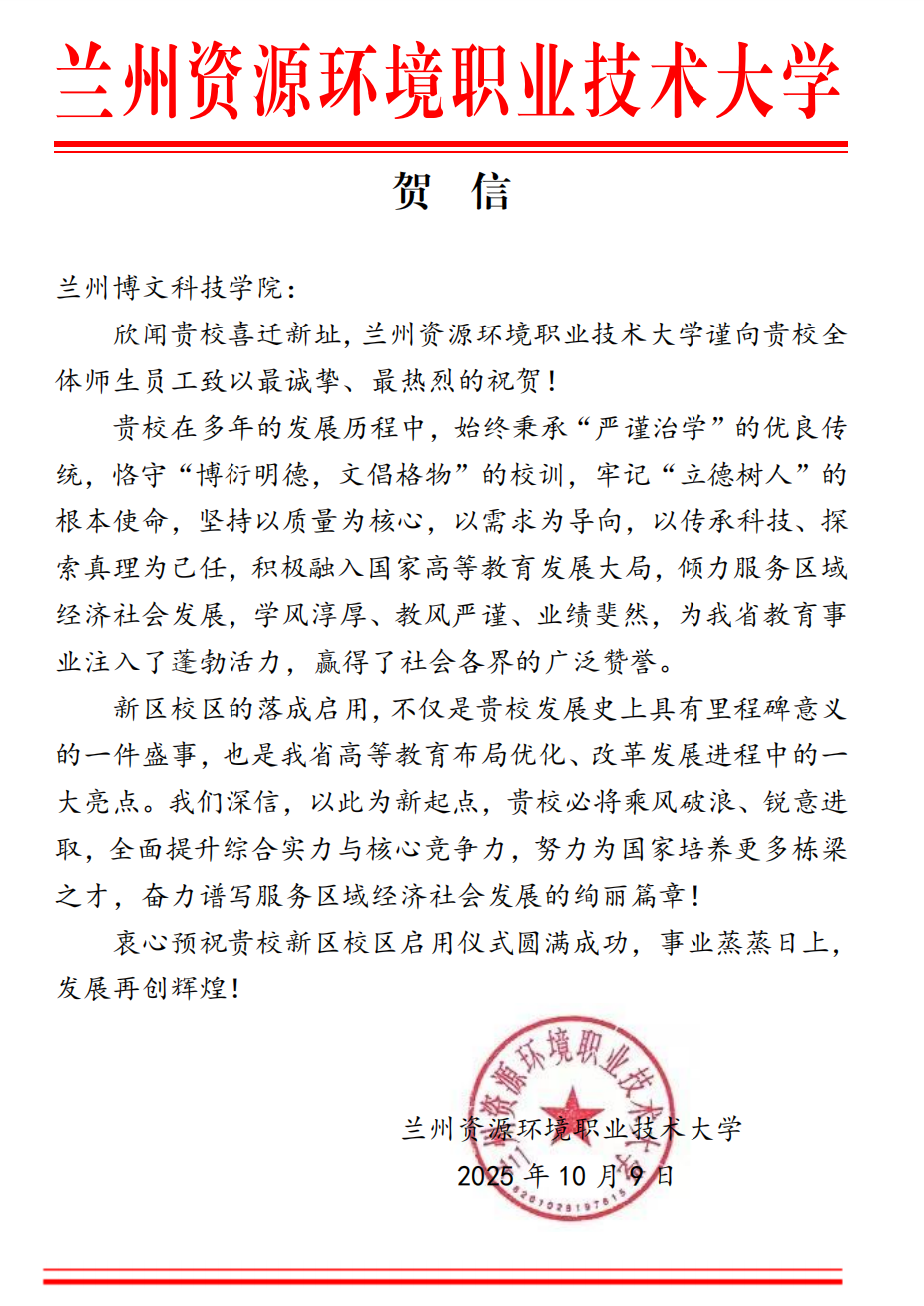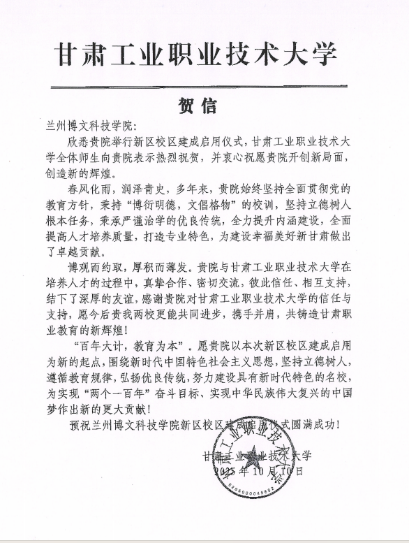 各高校在贺信中一致表达了对兰州博文科技学院新区校区顺利启用的热烈祝贺与美好祝愿。各高校均期待以此为契机,未来能在学科建设、人才培养及科研创新等领域,与兰州博文科技学院进一步深化交流,拓展合作空间,携手为高等教育事业的高质量发展贡献力量。