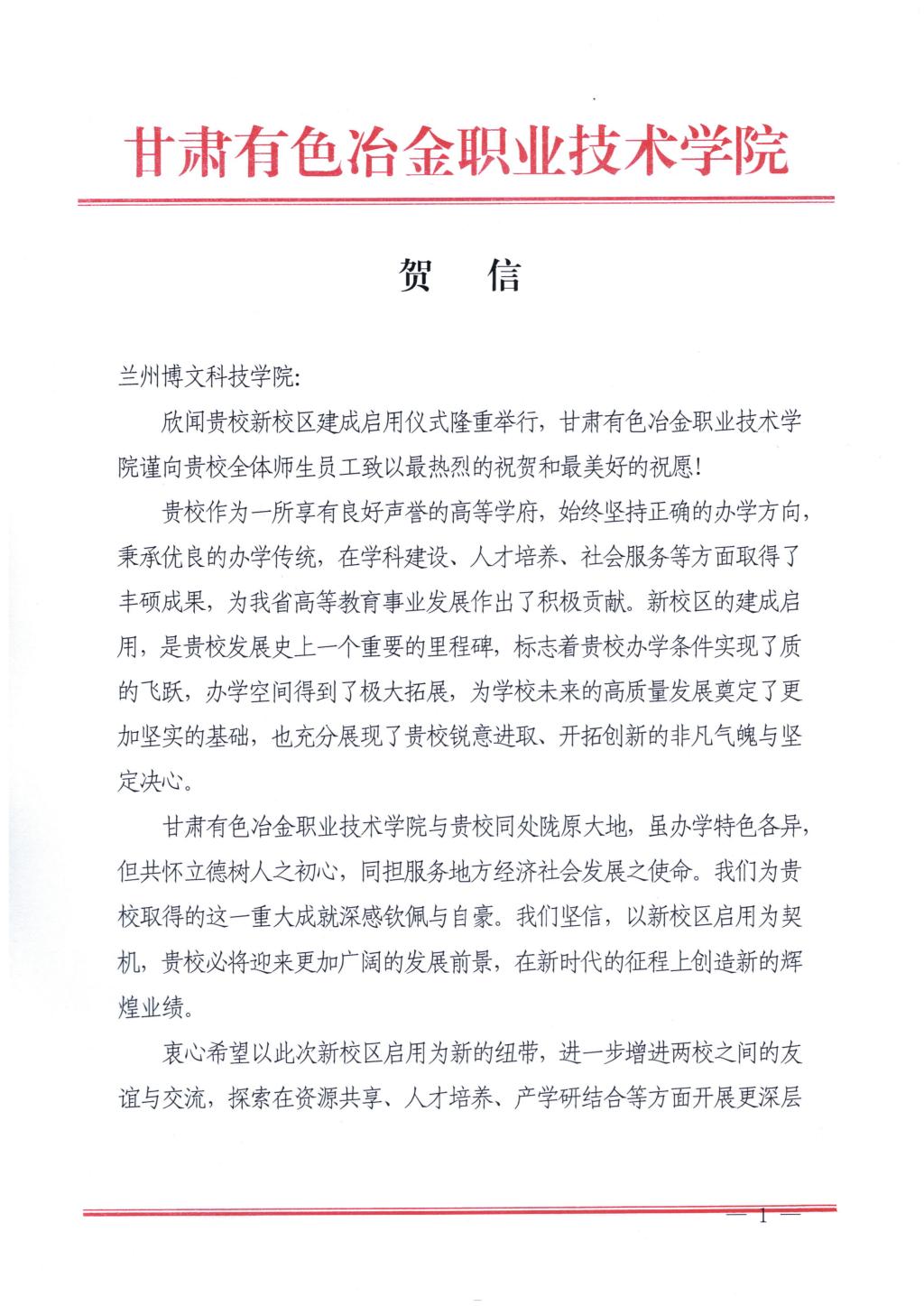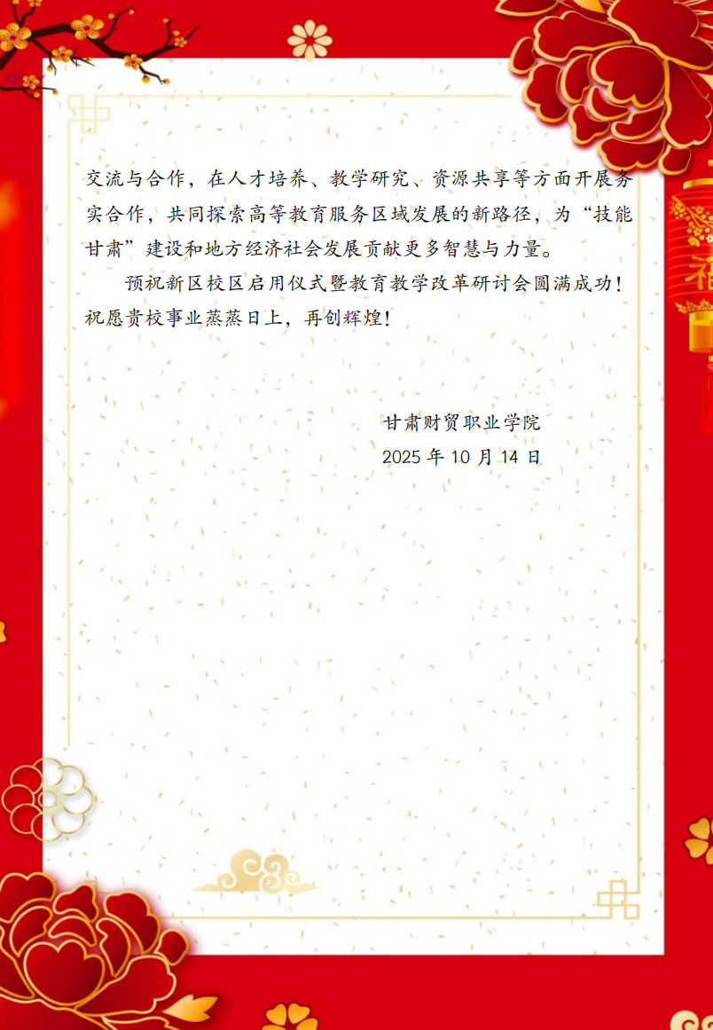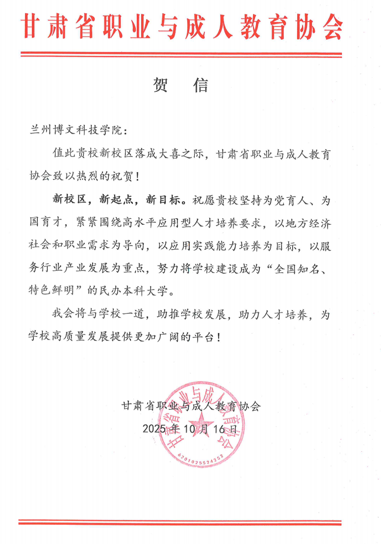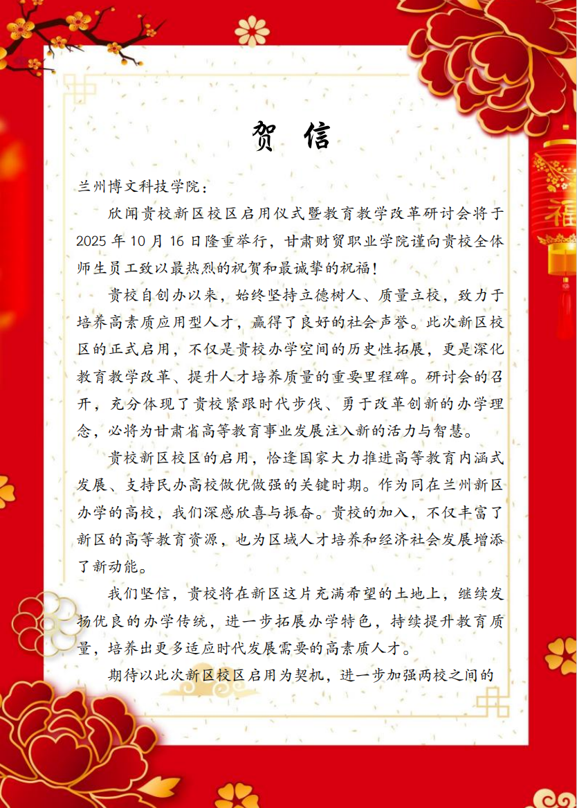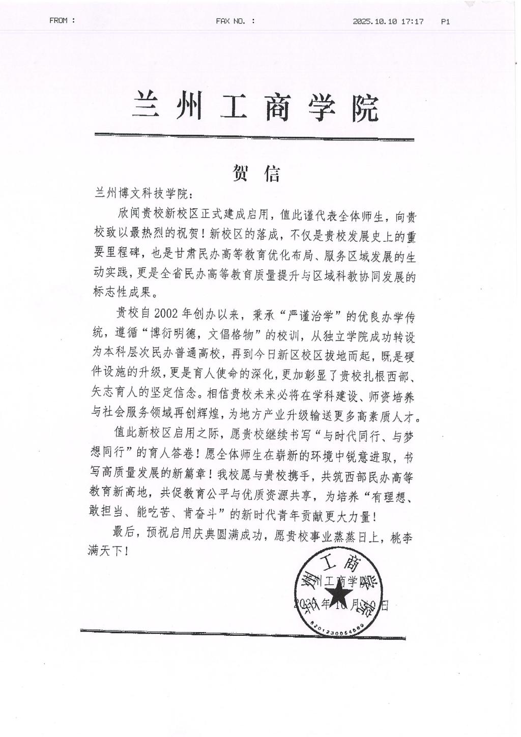 各高校在贺信中一致表达了对兰州博文科技学院新区校区顺利启用的热烈祝贺与美好祝愿。各高校均期待以此为契机,未来能在学科建设、人才培养及科研创新等领域,与兰州博文科技学院进一步深化交流,拓展合作空间,携手为高等教育事业的高质量发展贡献力量。