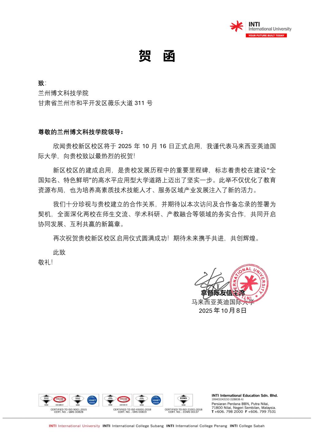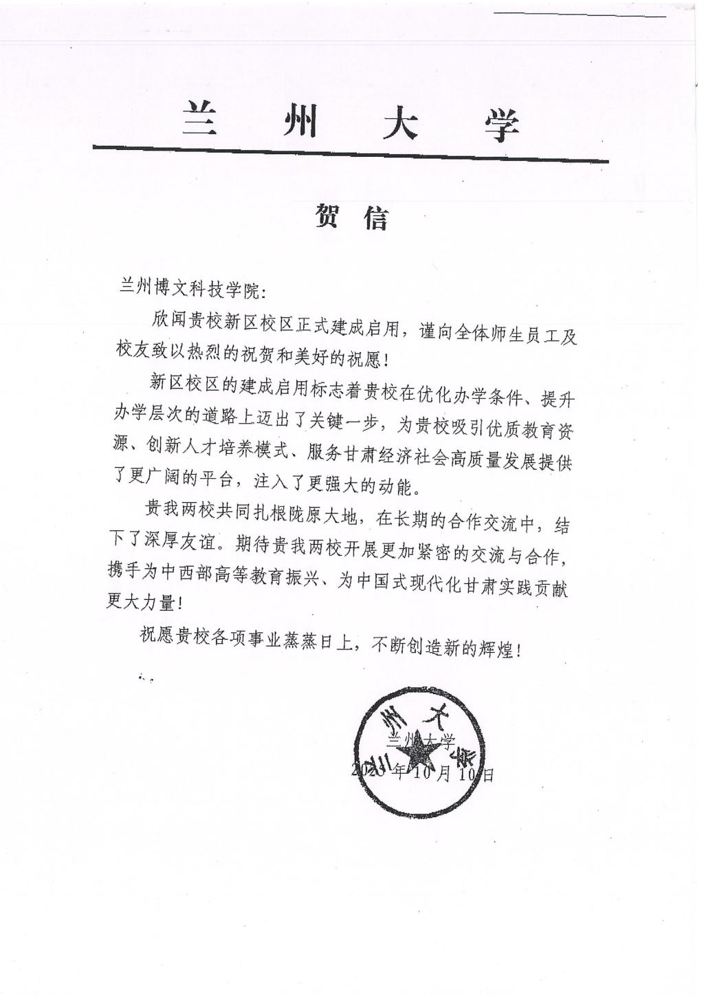 兰州博文科技学院将正式迎来新区校区启用仪式。值此之际,学校陆续收到来自国内外多所高校发来的贺信,共同庆贺新区校区正式启用。