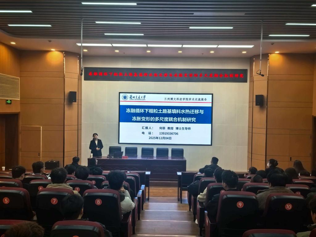 为聚焦冻土工程前沿课题,破解寒区交通建设技术难题,助力师生深化专业认知、拓宽学术视野,2025年12月4日下午,兰州博文科技学院土木工程学院联合教务处特邀兰州交通大学教授、博士生导师何菲在北校区综合教学楼小报告厅,作题为《冻融循环下粗粒土路基填料水热迁移与冻胀变形的多尺度耦合机制研究》的专题讲座。讲座由土木工程学院院长黄钰峰主持,全校相关专业师生积极参与交流。