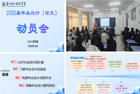 为深入落实学校毕业设计(论文)工作要求,强化应用型人才培养成效,严把人才培养质量关,近日,兰州博文科技学院土木工程学院分专业、分场次全面召开2026届本科生毕业设计(论文)动员大会。会议覆盖22级、24级土木工程、道路桥梁与渡河工程、水利水电工程、给排水科学与工程、建筑环境与能源应用工程等多个专业全体毕业生,实现学生知晓率100%,为后续工作有序开展筑牢基础。