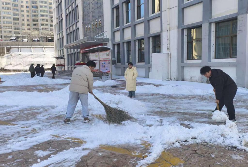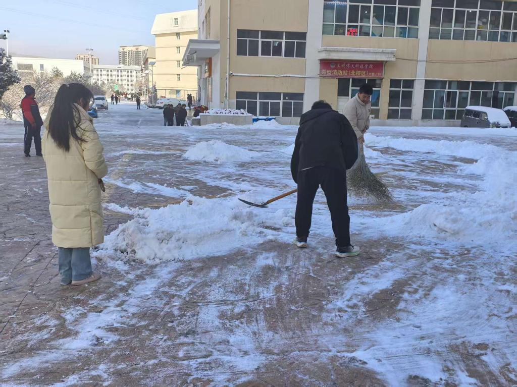 经过团委成员们的共同努力,教学楼门前的积雪被清理得干干净净,一条安全、畅通的道路呈现在同学们面前。同学们进出教学楼时,再也不用担心滑倒,可以安心地前往教室学习。看到同学们脸上洋溢的笑容,团委成员们也感到无比欣慰。