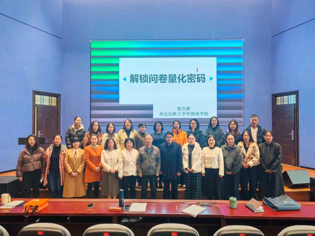为助力学科建设与人才培养,2025年11月7日下午,兰州博文科技学院外国语学院于新区校区图书馆报告厅开展专家系列讲座(二)——“解锁问卷量化密码” 专题学术讲座。本次讲座由外国语学院院长刘普主持,特邀西北民族大学外国语学院张汉彬教授担任主讲嘉宾,我院酒店管理专业全体学生及部分教师共同参与了此次学术盛宴。