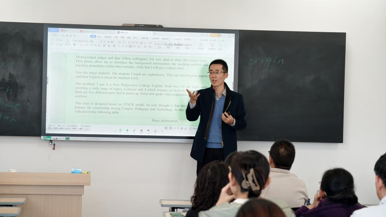 活动在热烈的掌声中拉开帷幕。徐洋老师以其在省赛中荣获特等奖的课程《Unit 4 Festivals》为蓝本,围绕“端午节”这一文化主题,呈现了一堂精彩纷呈的视听说示范课。课程巧妙运用多媒体技术与AI工具,通过精心剪辑的视频片段、智能语音互动等形式,营造出沉浸式的语言学习环境。徐老师深度融合CLIL(内容与语言整合教学法)与T-PACK(技术教学内容知识)框架,将语言技能训练、文化知识传授与思政育人目标有机统一,充分展现了“技术赋能教育、教育回归育人”的现代教学理念。