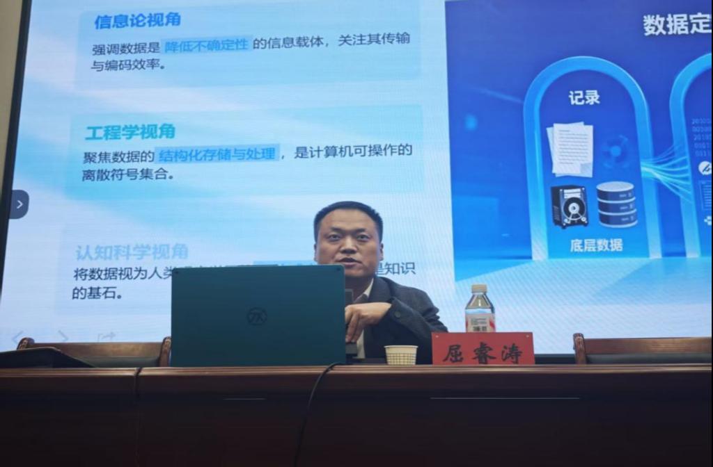 讲座中,屈睿涛博士以“从比特到资产”为核心线索,系统回溯了数据的产生历程与技术演进脉络,深刻阐述了数据作为继土地、劳动力、资本、技术之后的“第五大生产要素”所具有的理论基础与时代意义。他结合自身长期在信息化建设、智慧城市项目及数据运营一线的实战经验,对数据要素化的关键环节——包括数据分类、确权、定价、评估与交易机制——进行了层层深入的解读。