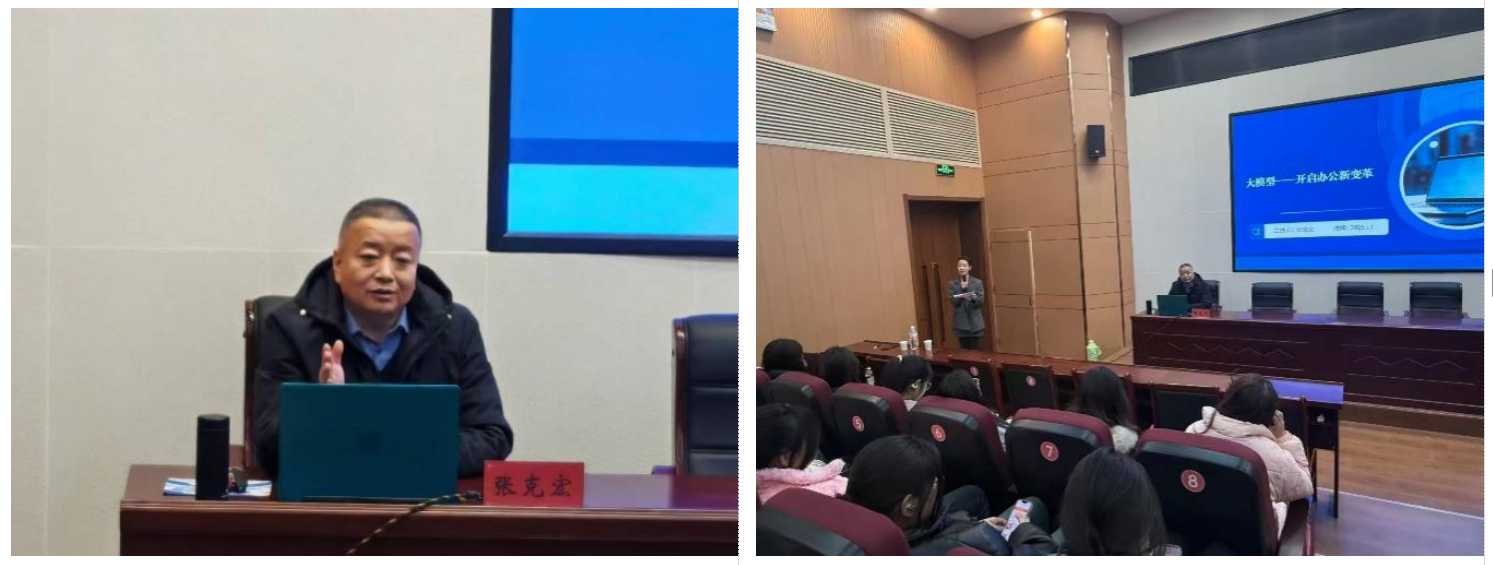 张克宏教授长期深耕图机器学习、智能图数据分析与处理、知识图谱与智慧管理等领域,具有深厚的学术造诣与丰富的实践经验。讲座开始,张教授系统梳理了人工智能特别是大模型技术的飞速发展历程,并精辟分析了其对传统办公模式带来的颠覆性影响与演进趋势。他从技术原理出发,深入浅出地阐释了大模型如何成为推动组织效率变革的核心驱动力。