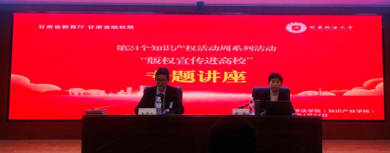 4月23日上午,在第24个世界知识产权日到来之际,甘肃省“版权宣传进高校”专题讲座在甘肃政法大学举办。我校科技处教师严晓娟、姚诗雨参加。本次讲座由甘肃省教育厅、省版权局等单位主办,省属在兰高校负责版权工作的部门人员、甘肃政法大学相关专业教师和学生240人参加。