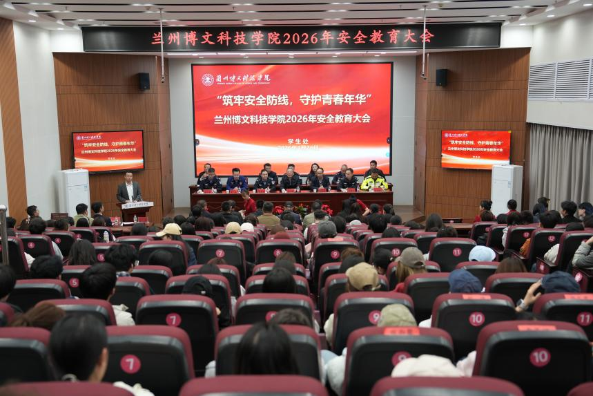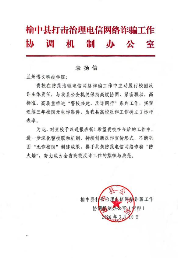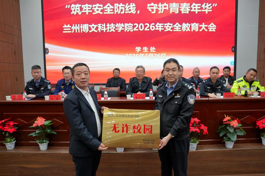 近日,学校收到榆中县打击治理电信网络诈骗工作协调机制办公室表扬信,对学校连续三年实现“校园无电诈案件”予以通报表扬。3月26日下午,学校在和平校区综合教学楼报告厅隆重举行“无诈校园”挂牌仪式暨2026年校园安全教育大会。属地公共安全、应急处置及法治保障领域的各单位应邀到场参会,学校校长陈正武、副校长刘德光,相关部门负责人、各学院党委书记、全体学生管理干部及学生代表参加会议。